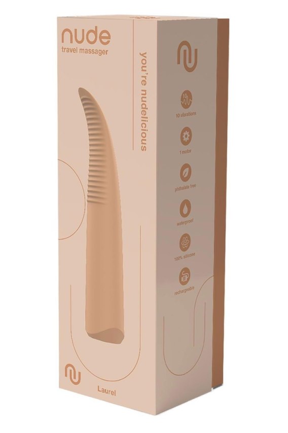 At Nude, we believe in the power of purity and quality. That’s why each and every one of our products is meticulously crafted to provide you with an experience that’s as natural as it gets. Say goodbye to anything less than extraordinary and unlock the true essence of pleasure with our clean and refined toys. Experience the pleasure revolution that’s sweeping the world â€" the Nude revolution. Our products are more than just toys they’re gateways to euphoria and liberation. Let’s get naked and unleash your most audacious fantasies with Nude’s premium range of sensual delights. It’s time to redefine pleasure, the Nude way.This travel sized Massager by Nude has single button operation to cycle through the 10 strong vibrations. It has 7 rhythms and 3 speeds. The flexible tip and stimulating ridges make this massager perfect for beginners and for anyone who likes subtle and tantalizing stimulation. The Nude massager Laurel is made of smooth soft silicone and ABS, free of phthalates and body safe. Laurel has an IPX6 rating for water resistance. For charging after use the vibrator has a waterproof charging hole. A USB pin cable is included. After a full charge your Nude vibe is ready for 90 minutes of nudelicous delight.Let’s get naked and discover the world of Nudelicious ecstasy!